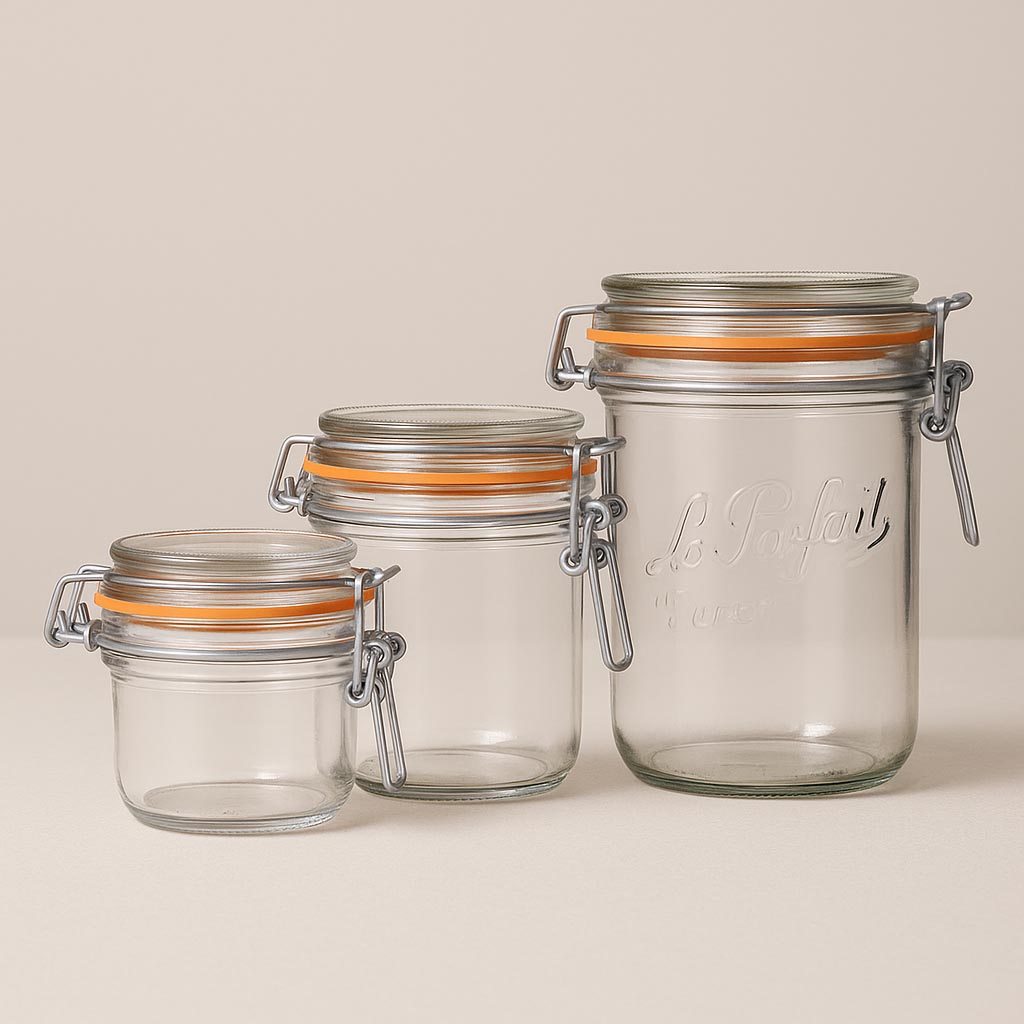 Serija "Super Terrine" brenda Le Parfait predstavlja autentičnu francusku zanatsku izradu i nudi visokokvalitetno rešenje za konzerviranje i prezentaciju hrane. Ovaj klasični stakleni teg sa žičanim zatvaračem i reljefom "Le Parfait Super" posebno je dizajniran kao teg za okretanje, što omogućava lako vađenje kolača, tortica i drugih poslastica. Takođe je idealan za džemove, mesne i kobasice konzerve, kao i za razne fine namaze. Sa zapreminom od 125 do 1000 ml, "Super Terrine" nudi raznovrsne mogućnosti upotrebe. Priloženi stakleni poklopac i karakteristični narandžasti gumeni prsten obezbeđuju sigurno, hermetičko zatvaranje.