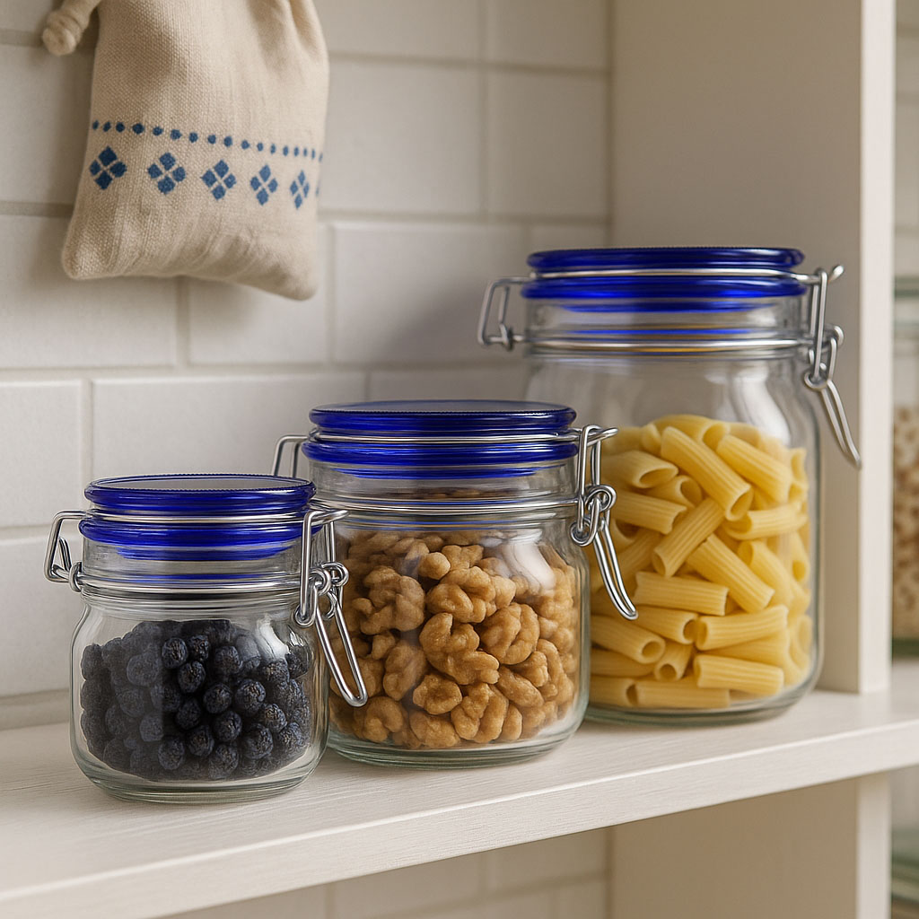 Serija „Fido Blue Top“ kombinuje dokazanu funkcionalnost sa modernim dizajnerskim detaljem. Proizvedena od strane italijanske tradicionalne kompanije Bormioli Rocco, ova visokokvalitetna staklena tegla sa žičanim zatvaračem oduševljava svojim kvadratnim oblikom i elegantnim plavim staklenim poklopcem koji joj daje estetski pečat. Dostupna u zapreminama od 500 do 2000 ml, „Fido Blue Top“ nudi raznovrsne mogućnosti upotrebe – od konzerviranja domaćih specijaliteta do stilskog čuvanja zaliha. Priloženi žičani zatvarač u kombinaciji sa staklenim poklopcem i gumicom obezbeđuje hermetičko zatvaranje.